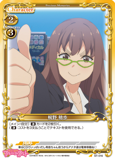 | [アプローチ/自分]:《2》カードを1枚引く。その場合、相手のキャラ1枚を休息状態にできる。このテキストは、自分の【制服】が5枚以上いる場合にのみ使用できる。(《2》:コストを2支払うことでテキストを使用できる。) | ||