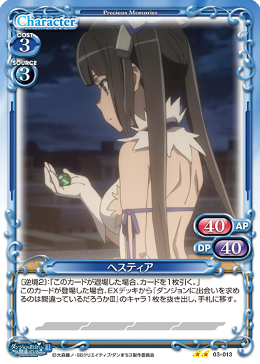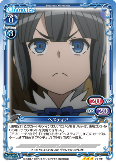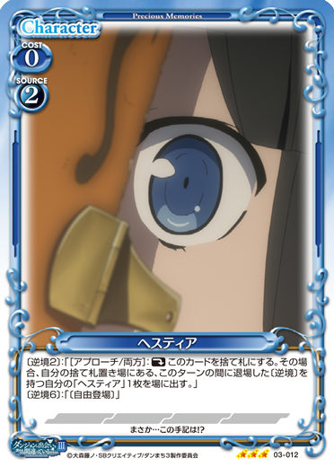 | 〔逆境2〕:「[アプローチ/両方]:《休》このカードを捨て札にする。その場合、自分の捨て札置き場にある、このターンの間に退場した〔逆境〕を持つ自分の「ヘスティア」1枚を場に出す。」〔逆境6〕:「〔自由登場〕」 | ||