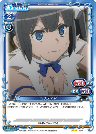 | 〔逆境2〕:「このカードがメインエリアにいる場合、相手は、使用コストが0のキャラのテキストを使用できない。」[アプローチ/自分]:「〔逆境〕を持つ「ヘスティア」」▶このカードは、ターン終了時まで〔アクティブ〕〔我慢〕〔強引〕を得る。 | ||