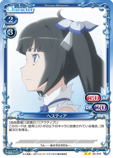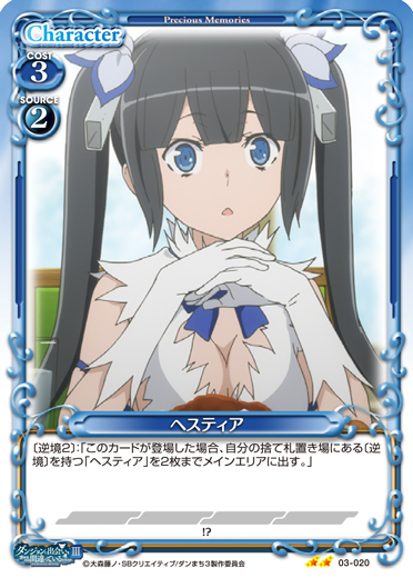 | 〔逆境2〕:「このカードが登場した場合、自分の捨て札置き場にある〔逆境〕を持つ「ヘスティア」を2枚までメインエリアに出す。」 | ||