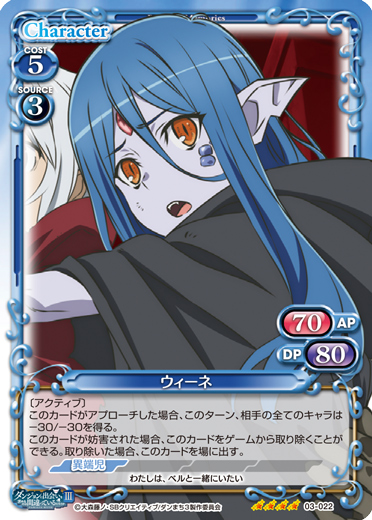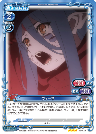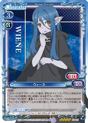 | このカードが登場した場合、手札にある「ウィーネ」1枚を捨て札にできる。捨て札にした場合、カードを2枚引く。その後、メインエリアに自分の「ウィーネ」が3枚以上いる場合、手札にある「ウィーネ」1枚を場に出すことができる。 | ||