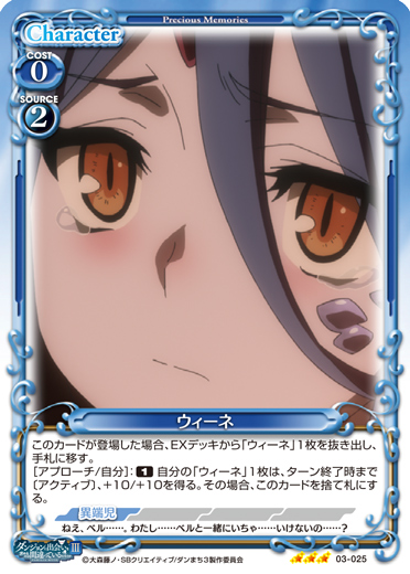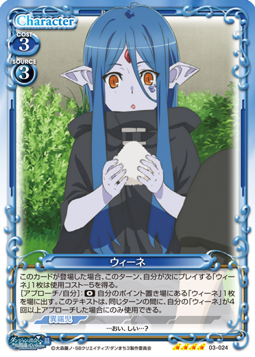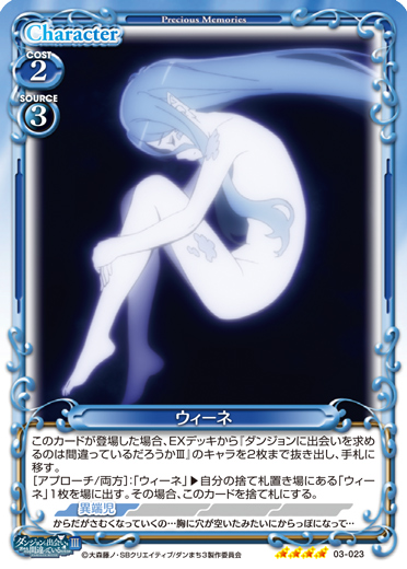 | このカードが登場した場合、EXデッキから『ダンジョンに出会いを求めるのは間違っているだろうかⅢ』のキャラを2枚まで抜き出し、手札に移す。[アプローチ/両方]:「ウィーネ」▶自分の捨て札置き場にある「ウィーネ」1枚を場に出す。その場合、このカードを捨て札にする。 | ||