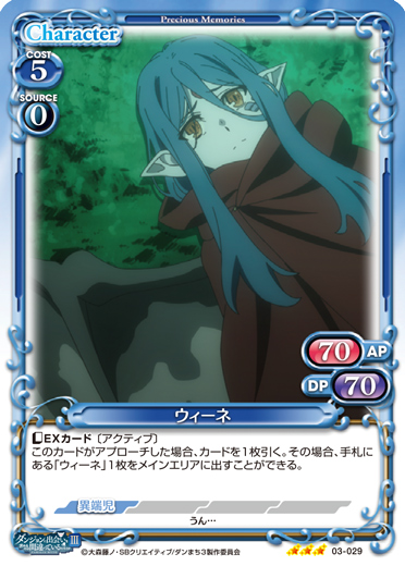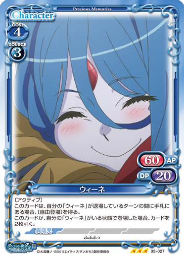 | 〔アクティブ〕このカードは、自分の「ウィーネ」が退場しているターンの間に手札にある場合、〔自由登場〕を得る。このカードが、自分の「ウィーネ」がいる状態で登場した場合、カードを2枚引く。 | ||