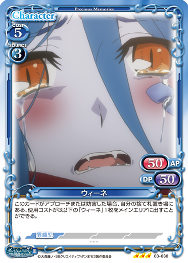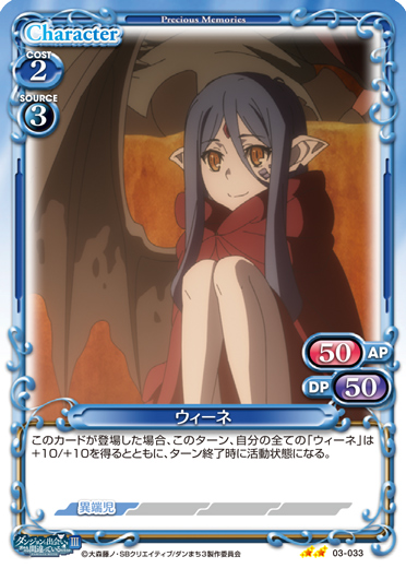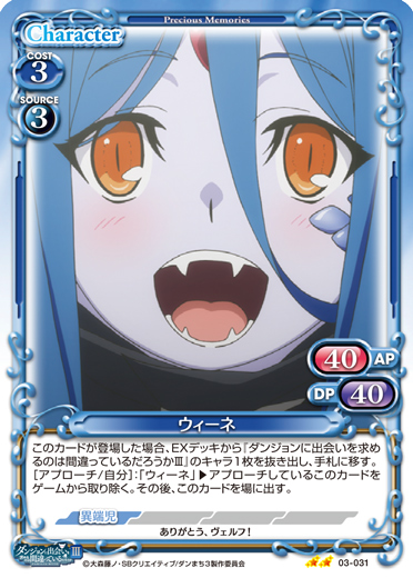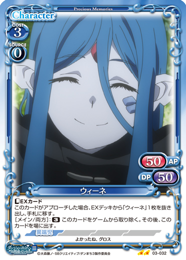 | このカードが登場した場合、EXデッキから『ダンジョンに出会いを求めるのは間違っているだろうかⅢ』のキャラ1枚を抜き出し、手札に移す。[アプローチ/自分]:「ウィーネ」▶アプローチしているこのカードをゲームから取り除く。その後、このカードを場に出す。 | ||
