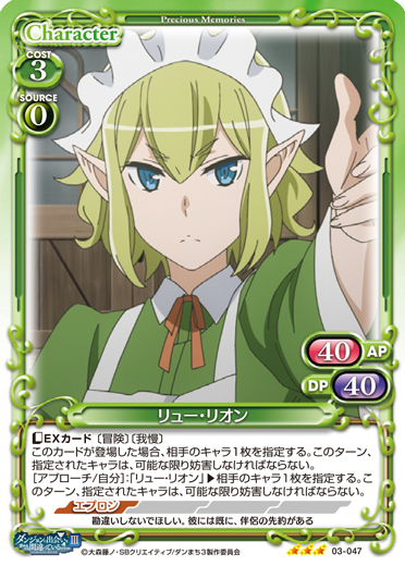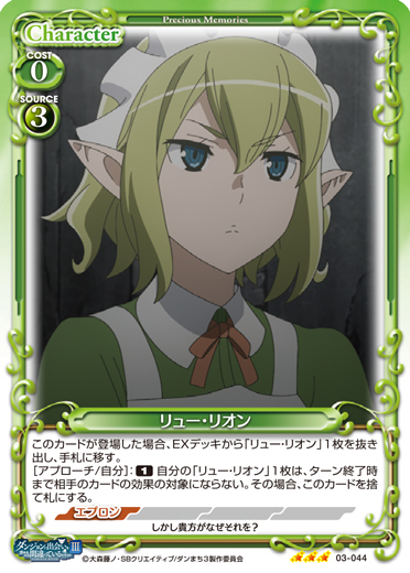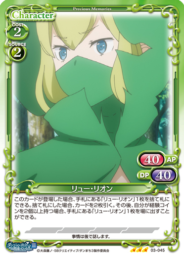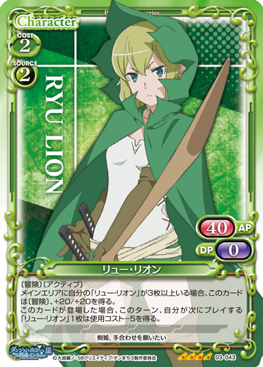 | 〔冒険〕〔アクティブ〕メインエリアに自分の「リュー・リオン」が3枚以上いる場合、このカードは〔冒険〕、+20/+20を得る。このカードが登場した場合、このターン、自分が次にプレイする「リュー・リオン」1枚は使用コスト-5を得る。 | ||