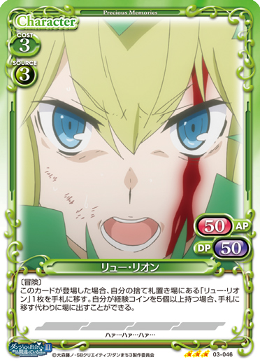 | このカードが登場した場合、手札にある「リュー・リオン」1枚を捨て札にできる。捨て札にした場合、カードを2枚引く。その後、自分が経験コインを2個以上持つ場合、手札にある「リュー・リオン」1枚を場に出すことができる。 | ||
