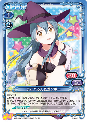 | 〔コンビ〕このカードは、「ミラクるん」がいる場合、+10/±0を得る。相手のキャラがアプローチに参加した場合、自分の「ライバるん」1枚は、ターン終了時まで+10/+10を得る。または、活動状態になる。 | ||