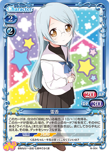 | このカードは、自分の「雷香」がいる場合、+10/+10を得る。このカードが登場した場合、デッキの上のカード7枚を見て、その中にある「ミラクるん」または「胡桃」1枚を抜き出し、表にしてから手札に加える。その後、デッキをシャッフルする。 | ||