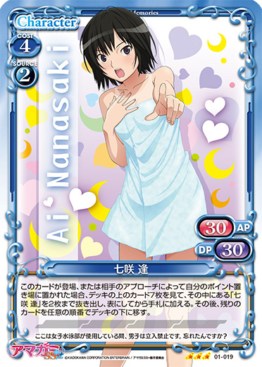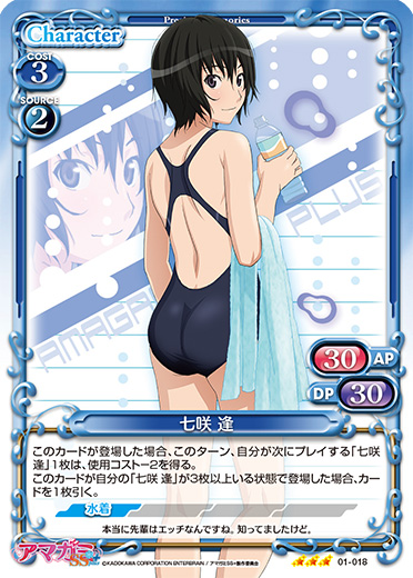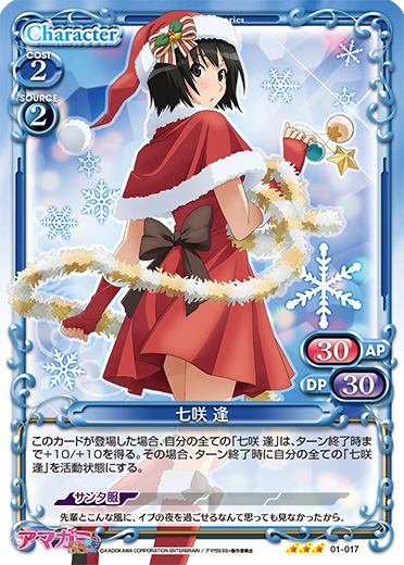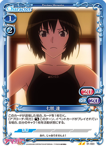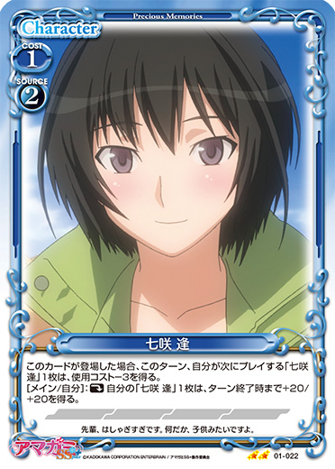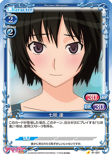 | このカードが登場した場合、このターン、自分が次にプレイする「七咲 逢」1枚は、使用コスト-3を得る。 | ||