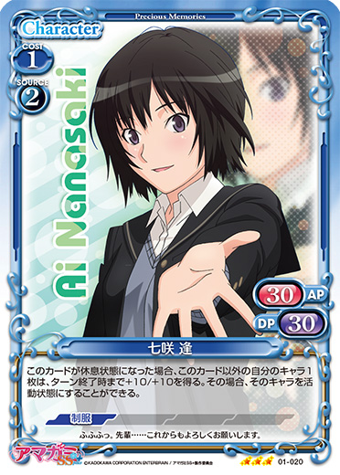| このカードが登場した場合、このターン、自分が次にプレイする「七咲 逢」1枚は、使用コスト-3を得る。[メイン/自分]:《休》自分の「七咲 逢」1枚は、ターン終了時まで+20/+20を得る。 | ||