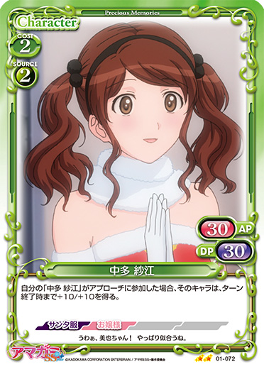 | 自分の「中多 紗江」がアプローチに参加した場合、そのキャラは、ターン終了時まで+10/+10を得る。 | ||