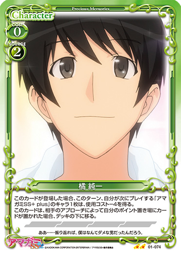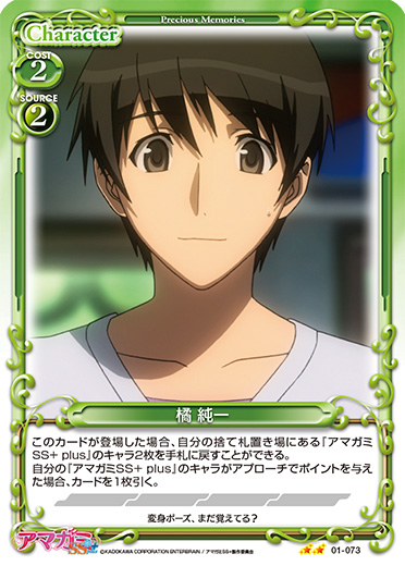 | このカードが登場した場合、デッキの上のカード7枚を見て、その中にある「桜井 梨穂子」または「橘 純一」1枚を抜き出し、表にしてから手札に加える。その後、残りのカードを任意の順番でデッキの下に移す。 | ||
