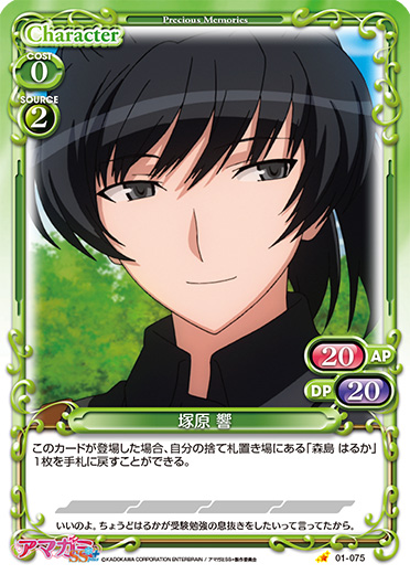 | このカードが登場した場合、このターン、自分が次にプレイする『アマガミSS+ plus』のキャラ1枚は、使用コスト-4を得る。このカードは、相手のアプローチによって自分のポイント置き場にカードが置かれた場合、デッキの下に移る。 | ||
