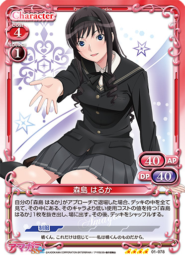 | このカードが登場した場合、自分の捨て札置き場にある「森島 はるか」1枚を手札に戻すことができる。 | ||