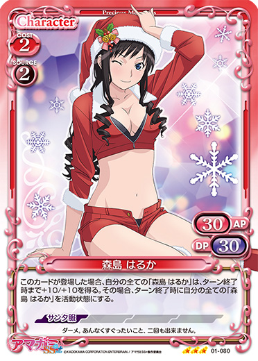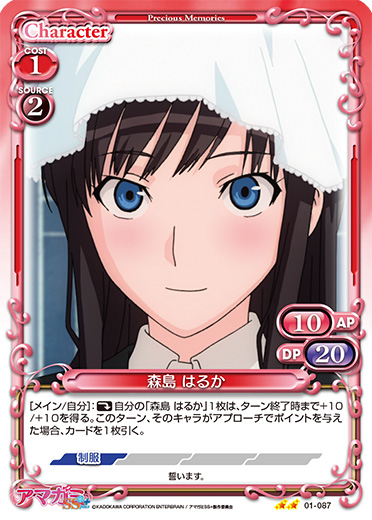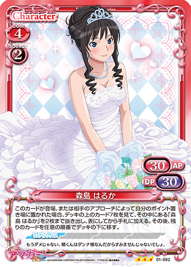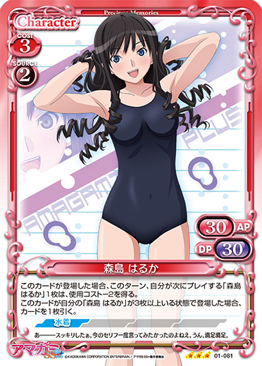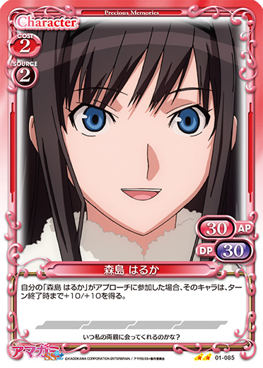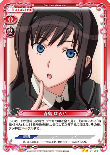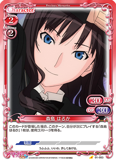 | このカードが登場した場合、このターン、自分が次にプレイする「森島 はるか」1枚は、使用コスト-3を得る。 | ||