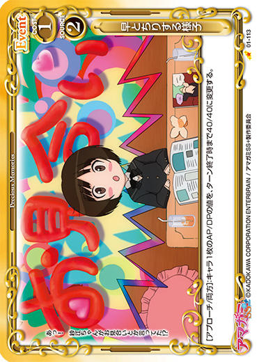 | [アプローチ/両方]:キャラ1枚のAP/DPの値を、ターン終了時まで40/40に変更する。 | ||