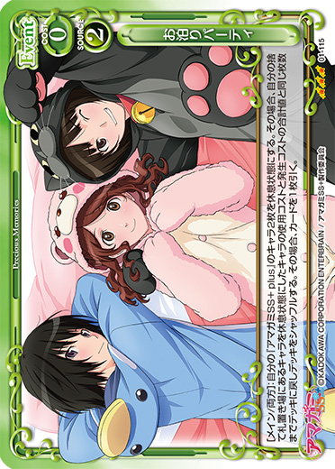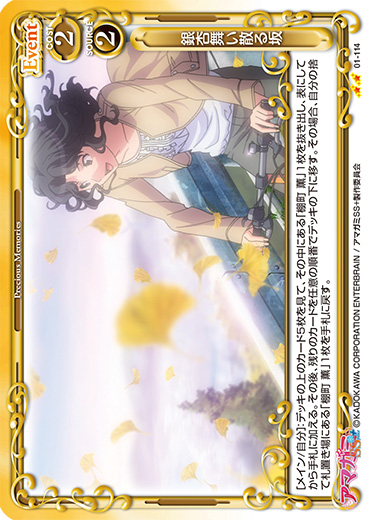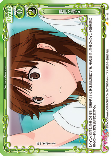| [メイン/相手]:自分の「桜井 梨穂子」1枚を休息状態にする。その場合、自分のポイント置き場にあるカード2枚を表向きにする。 | ||