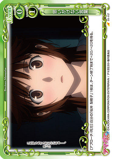 | [アプローチ/両方]:自分の「桜井 梨穂子」1枚は、ターン終了時まで+20/+20を得る。 | ||