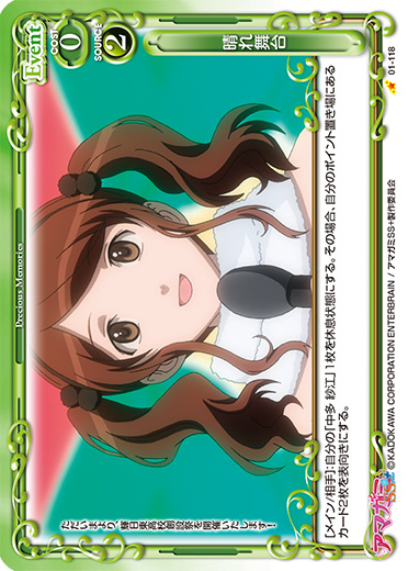 | [メイン/相手]:自分の「中多 紗江」1枚を休息状態にする。その場合、自分のポイント置き場にあるカード2枚を表向きにする。 | ||