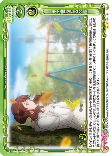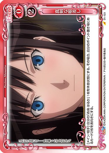 | [メイン/相手]:自分の「森島 はるか」1枚を休息状態にする。その場合、自分のポイント置き場にあるカード2枚を表向きにする。 | ||