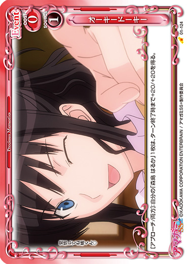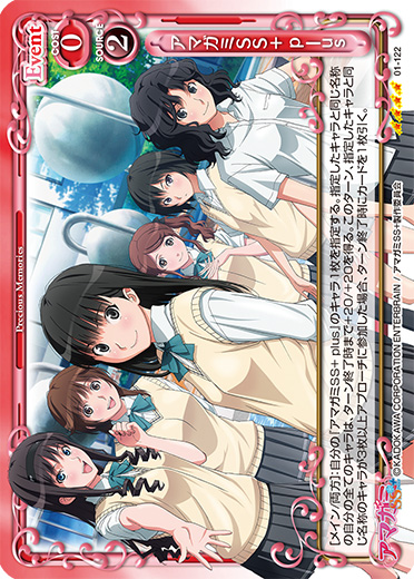 | [メイン/両方]:自分の『アマガミSS+ plus』のキャラ1枚を指定する。指定したキャラと同じ名称の自分の全てのキャラは、ターン終了時まで+20/+20を得る。このターン、指定したキャラと同じ名称のキャラが3枚以上アプローチに参加した場合、ターン終了時にカードを1枚引く。 | ||