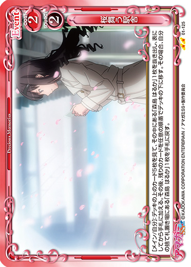 | [メイン/自分]:デッキの上のカード5枚を見て、その中にある「桜井 梨穂子」1枚を抜き出し、表にしてから手札に加える。その後、残りのカードを任意の順番でデッキの下に移す。その場合、自分の捨て札置き場にある「桜井 梨穂子」1枚を手札に戻す。 | ||