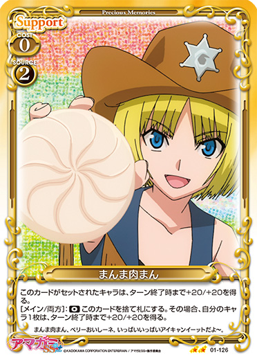 | このカードがセットされたキャラは、ターン終了時まで+20/+20を得る。[メイン/両方]:《0》このカードを捨て札にする。その場合、自分のキャラ1枚は、ターン終了時まで+20/+20を得る。 | ||