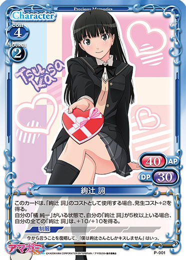 | このカードは、「絢辻 詞」のコストとして使用する場合、発生コスト+2を得る。自分の「橘 純一」がいる状態で、自分の「絢辻 詞」が5枚以上いる場合、自分の全ての「絢辻 詞」は、+10/+10を得る。 | ||