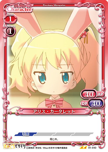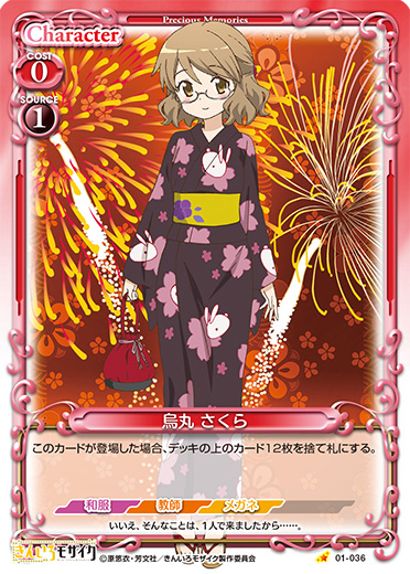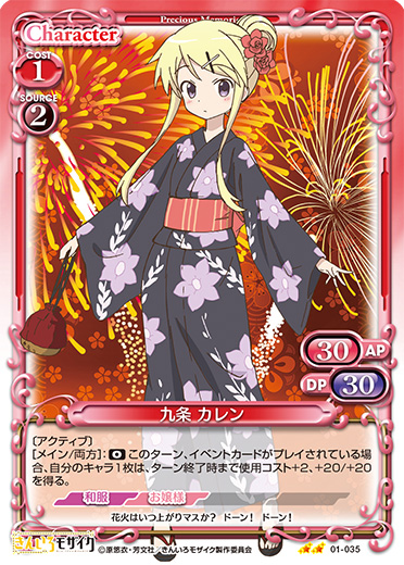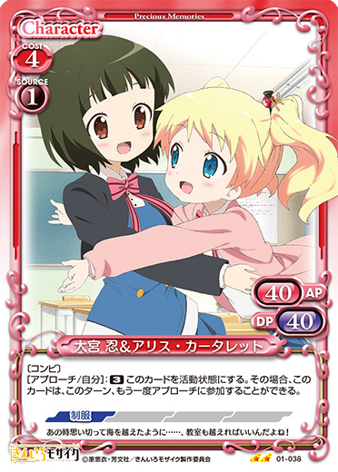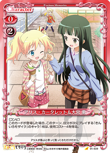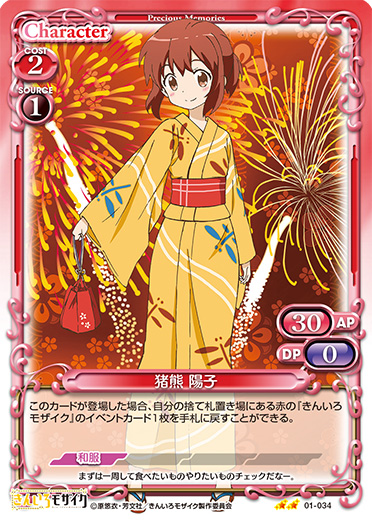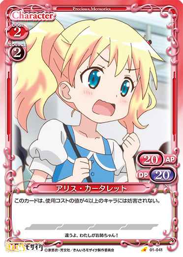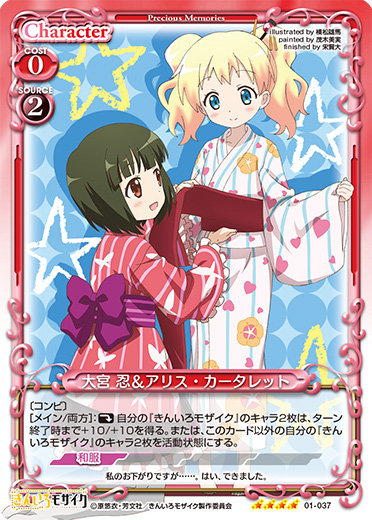 | 〔コンビ〕このカードが登場した場合、このターン、自分が次にプレイする『きんいろモザイク』のキャラ1枚は、使用コスト-4を得る。 | ||