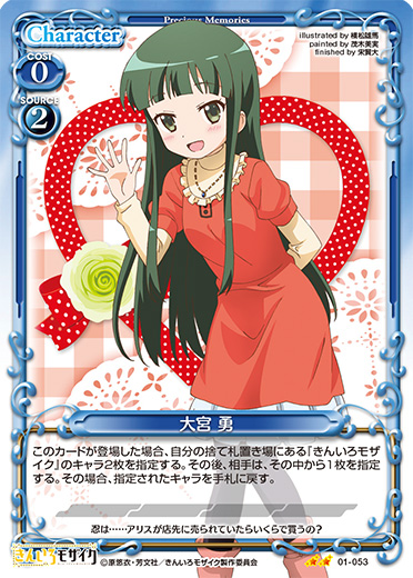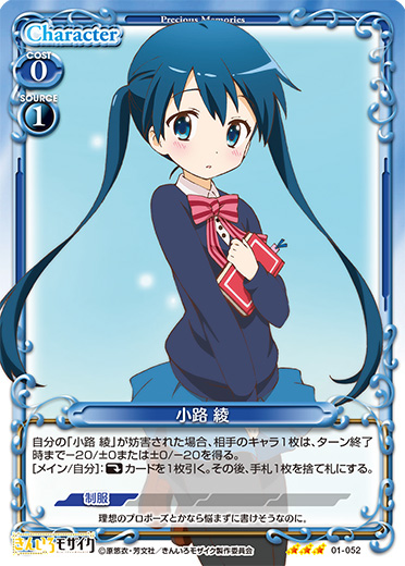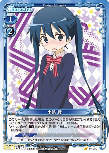 | このカードが登場した場合、このターン、自分が次にプレイする『きんいろモザイク』のキャラ1枚は、使用コスト-3を得る。[メイン/自分]:《休》自分の「小路 綾」1枚は、ターン終了時まで+20/+20を得る。 | ||