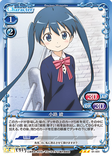 | このカードが登場した場合、デッキの上のカード5枚を見て、その中にある「小路 綾」または「猪熊 陽子」1枚を抜き出し、表にしてから手札に加える。その後、残りのカードを任意の順番でデッキの下に移す。 | ||