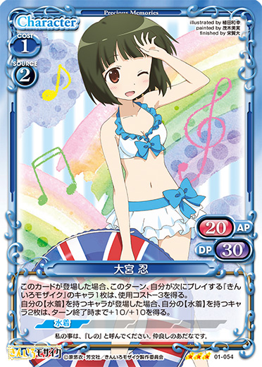 | このカードが登場した場合、このターン、自分が次にプレイする『きんいろモザイク』のキャラ1枚は、使用コスト-3を得る。自分の【水着】を持つキャラが登場した場合、自分の【水着】を持つキャラ2枚は、ターン終了時まで+10/+10を得る。 | ||