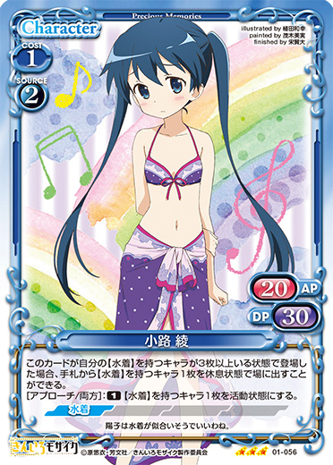 | 自分の「小路 綾」が妨害された場合、相手のキャラ1枚は、ターン終了時まで-20/±0または±0/-20を得る。[メイン/自分]:《休》カードを1枚引く。その後、手札1枚を捨て札にする。 | ||