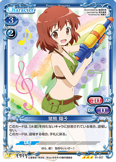 | このカードは、【水着】を持たないキャラに妨害されている場合、退場しない。このカードは、退場する場合、手札に戻る。 | ||