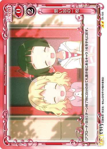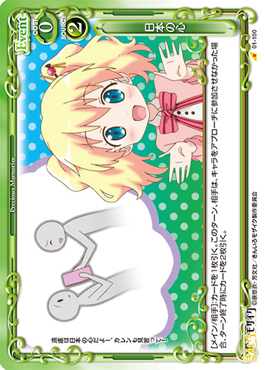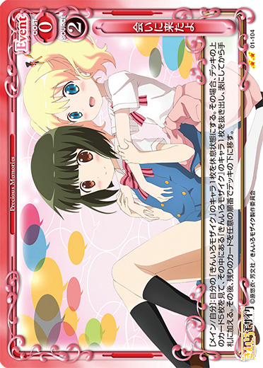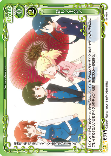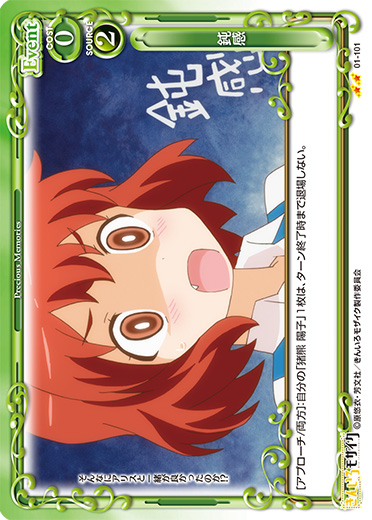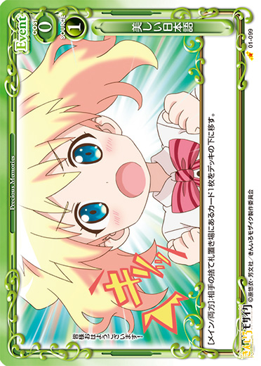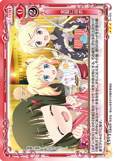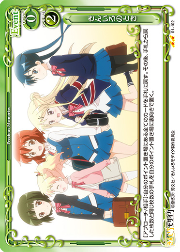 | [メイン/自分]:このターン、自分が次にプレイする『きんいろモザイク』のキャラ1枚と、その次にプレイする『きんいろモザイク』のキャラ1枚は、使用コスト-2を得る。 | ||