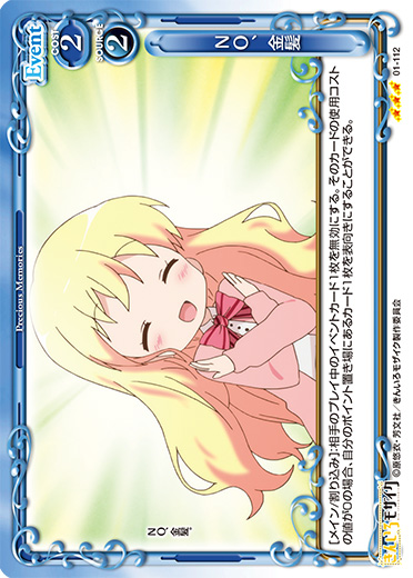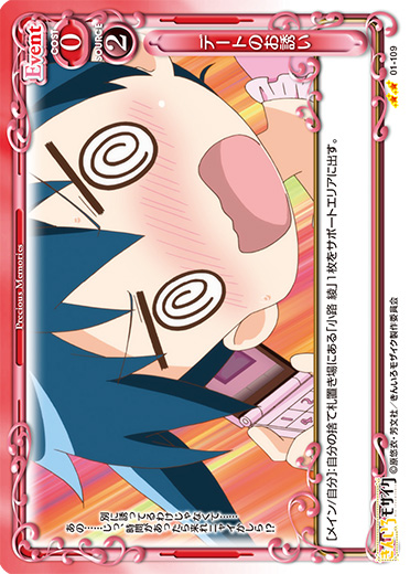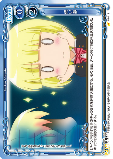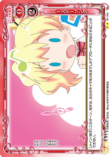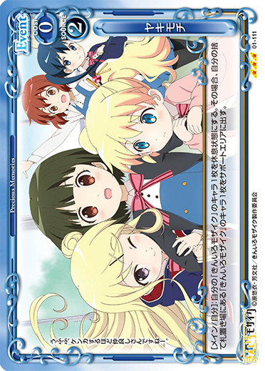 | [メイン/自分]:自分の『きんいろモザイク』のキャラ1枚を休息状態にする。その場合、自分の捨て札置き場にある『きんいろモザイク』のキャラ1枚をサポートエリアに出す。 | ||