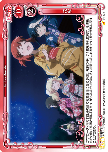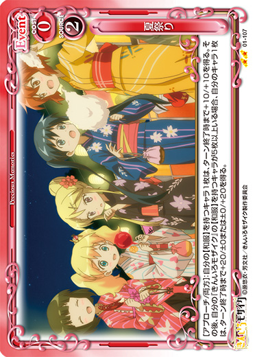 | [アプローチ/両方]:自分の捨て札置き場にある【和服】を持つキャラ1枚を手札に戻す。その後、自分の捨て札置き場に「夏祭り」がある場合、自分の捨て札置き場にあるキャラ1枚を手札に戻すことができる。 | ||