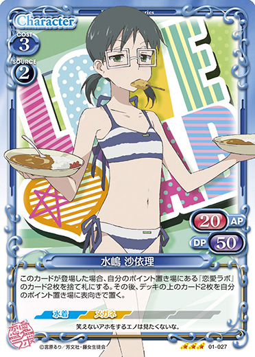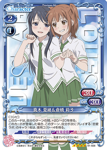 | 〔コンビ〕このカードは、自分のターンの間、+20/+20を得る。このカードが登場した場合、このターン、自分が次にプレイする『恋愛ラボ』のキャラ1枚は、使用コスト-4を得る。 | ||