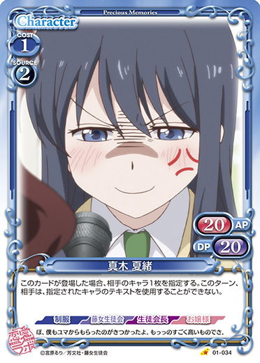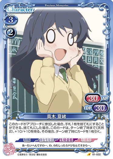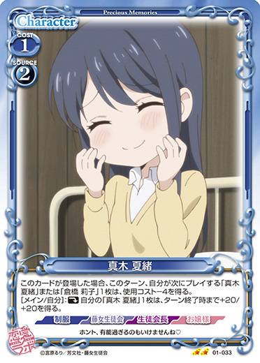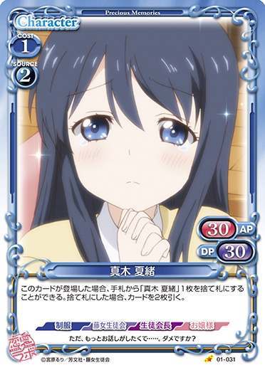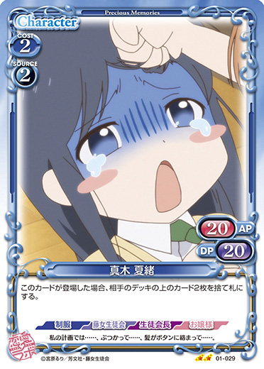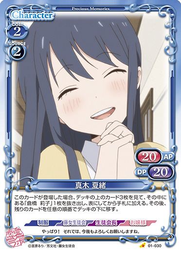 | このカードが登場した場合、このターン、自分が次にプレイする「真木 夏緒」または「倉橋 莉子」1枚は、使用コスト-4を得る。[メイン/自分]:《休》自分の「真木 夏緒」1枚は、ターン終了時まで+20/+20を得る。 | ||