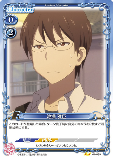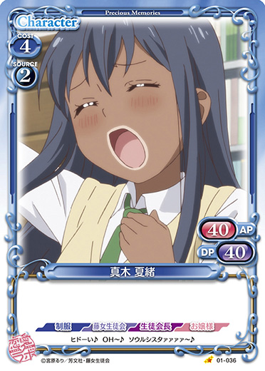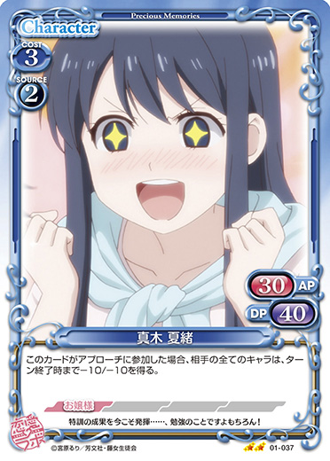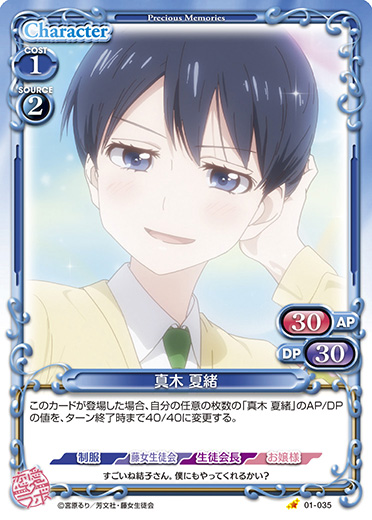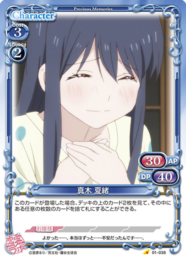 | このカードが登場した場合、自分の任意の枚数の「真木 夏緒」のAP/DPの値を、ターン終了時まで40/40に変更する。 | ||