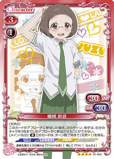 | 〔天然2〕このカードがアプローチに参加した場合、次のターン、相手は、自分のキャラを3枚までしかアプローチに参加させることができない。[メイン/自分]:《3》このカードは、ターン終了時まで〔天然+1〕を得る。 | ||