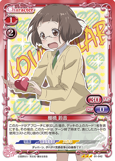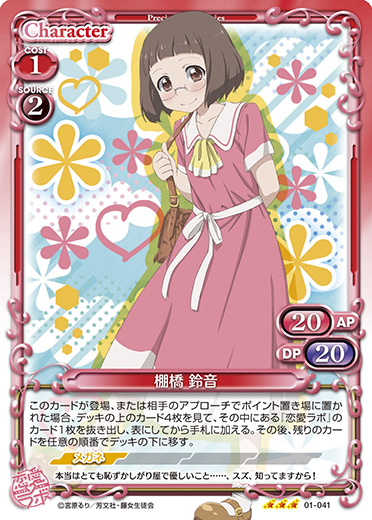 | このカードが登場、または相手のアプローチでポイント置き場に置かれた場合、デッキの上のカード4枚を見て、その中にある『恋愛ラボ』のカード1枚を抜き出し、表にしてから手札に加える。その後、残りのカードを任意の順番でデッキの下に移す。 | ||