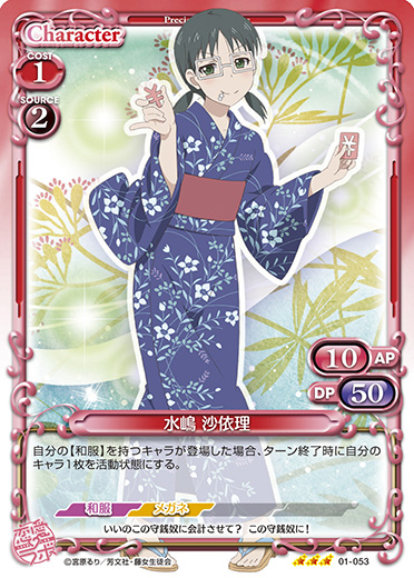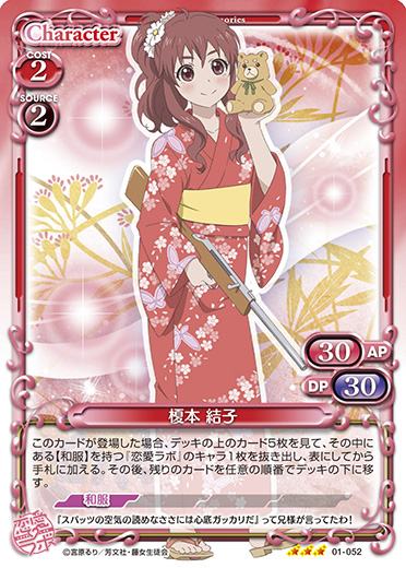 | このカードが登場した場合、デッキの上のカード5枚を見て、その中にある【和服】を持つ『恋愛ラボ』のキャラ1枚を抜き出し、表にしてから手札に加える。その後、残りのカードを任意の順番でデッキの下に移す。 | ||