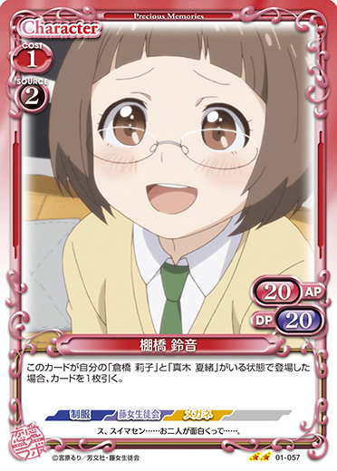 | このカードが自分の「倉橋 莉子」と「真木 夏緒」がいる状態で登場した場合、カードを1枚引く。 | ||