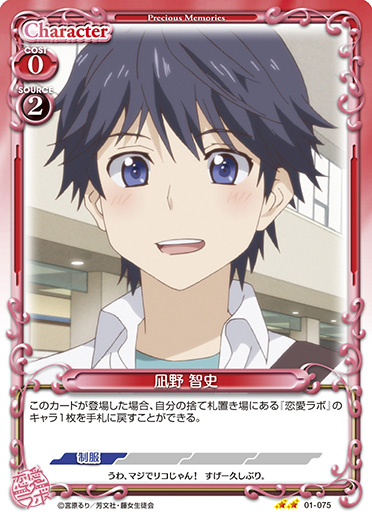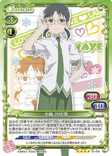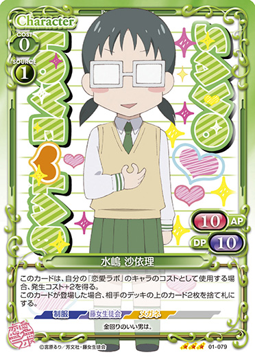 | このカードが登場した場合、自分の捨て札置き場にある『恋愛ラボ』のキャラ1枚を手札に戻すことができる。 | ||