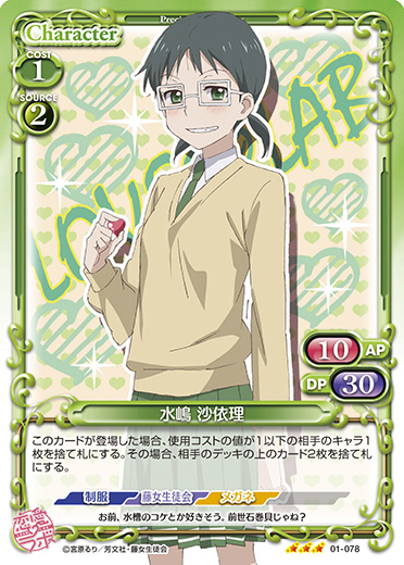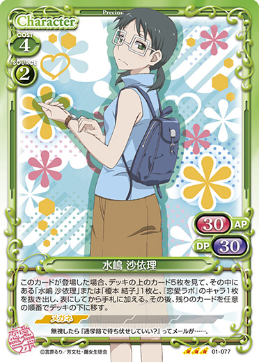 | このカードが登場した場合、デッキの上のカード5枚を見て、その中にある「水嶋 沙依理」または「榎本 結子」1枚と、『恋愛ラボ』のキャラ1枚を抜き出し、表にしてから手札に加える。その後、残りのカードを任意の順番でデッキの下に移す。 | ||