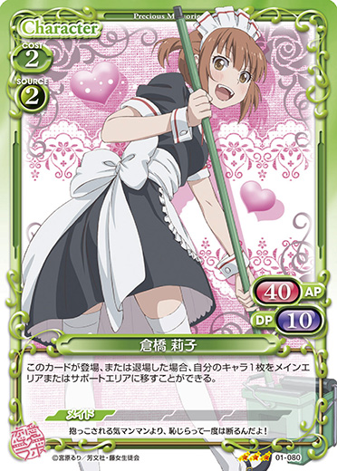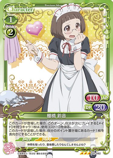 | このカードが登場した場合、このターン、自分が次にプレイする【メイド】を持つキャラ1枚は、使用コスト-3を得る。このカードが退場した場合、自分のポイント置き場にあるカード1枚を表向きにすることができる。 | ||