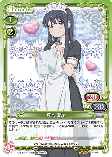 | このカードが妨害された場合、自分の【メイド】を持つキャラ1枚を手札に戻す。その場合、妨害に参加している相手のキャラ1枚をデッキの下に移す。 | ||