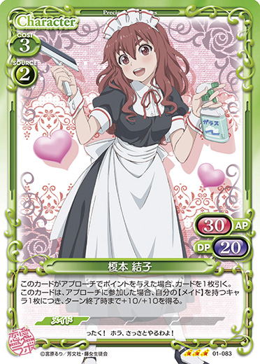 | このカードがアプローチでポイントを与えた場合、カードを1枚引く。このカードは、アプローチに参加した場合、自分の【メイド】を持つキャラ1枚につき、ターン終了時まで+10/+10を得る。 | ||