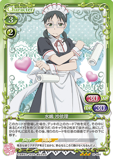 | このカードが登場した場合、デッキの上のカード7枚を見て、その中にある【メイド】を持つ『恋愛ラボ』のキャラを2枚まで抜き出し、表にしてから手札に加える。その後、残りのカードを任意の順番でデッキの下に移す。 | ||